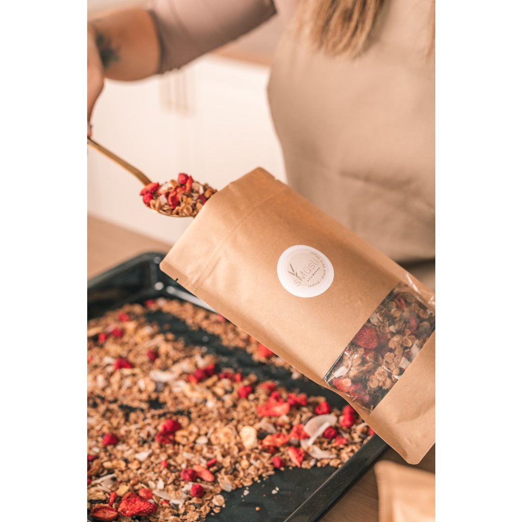 Směs müsli Výjimečná vám vykouzlí úsměv na tváři. Perfektně propečená směs křupavých vloček a kokosových lupínků, na jazyku se rozplývající lyofilizované banány, jahody a maliny a jako třešinka na dortu kvalitní hořká čokoláda. Není divu, že tato příchuť stála za zrodem celého projektu domácí granoly. Ochutnejte i vy srdcovou směs značky sMüsli. Tu Výjimečnou jedinečnou směs, kterou to všechno začalo.